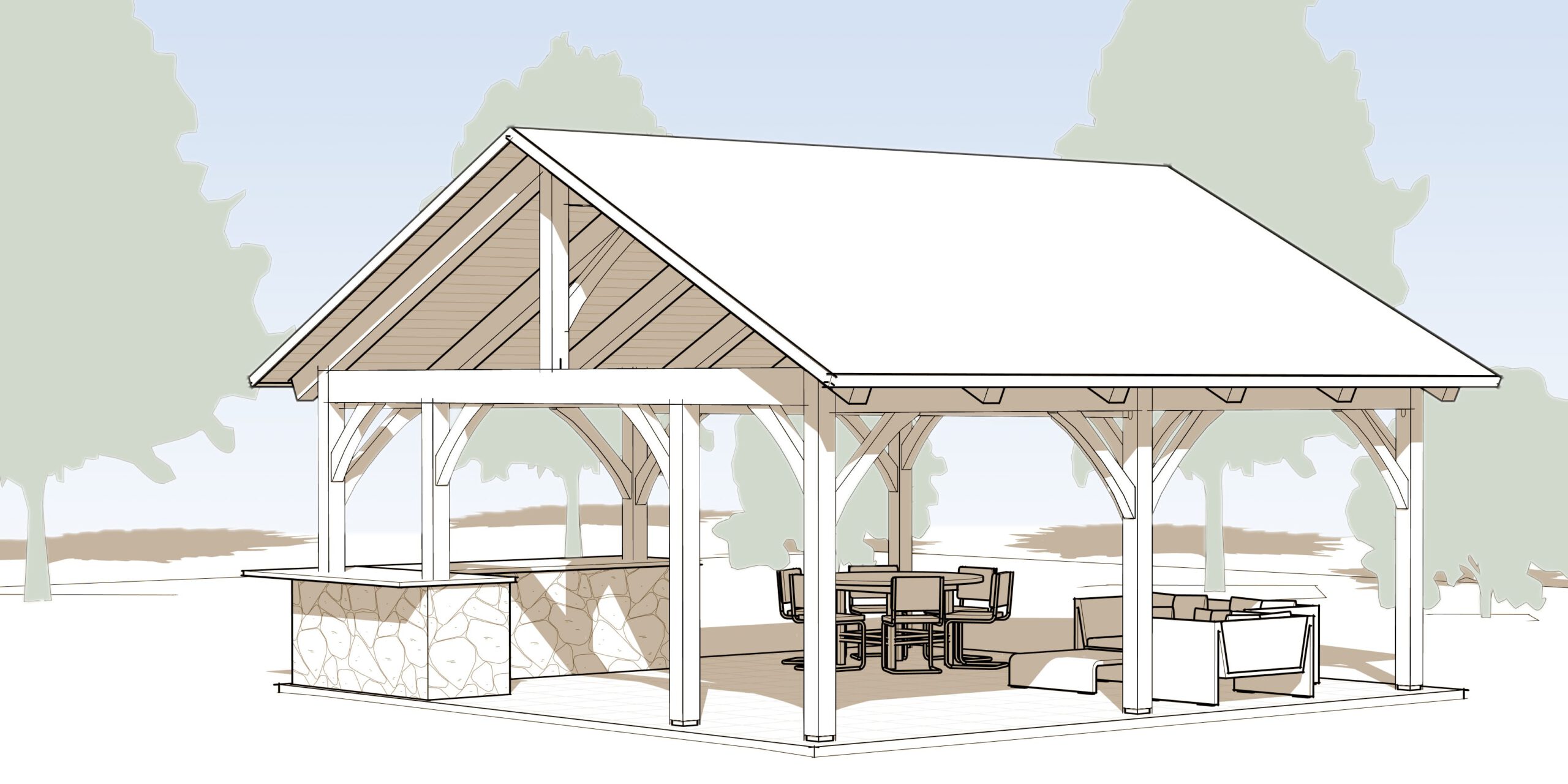 Brooks Post & Beam offers pavilion kits in a number of pre-drawn sizes, but you can also request a different size that works for your site and planned uses. We may need to modify the structure based on the design requirements for your location. Since it’s made with a Brooks frame, there’s always the option to close in the pavilion with walls any time in the future.